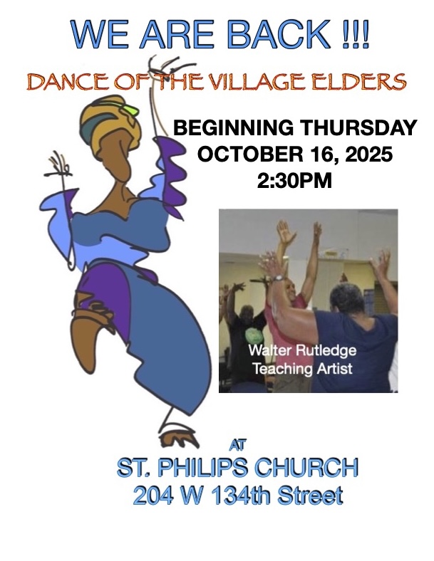 The Dance of the Village Elders is returning to St. Philips Church, 204 W 134th Street beginning Thursday October 16th, at 2:30pm. The senior wellness classes, which uses dance as the primary medium was a mainstay in the Harlem community. The participates learned choreography, in addition to the wellness/fitness training, and presented biannual concerts in St. Philips’ sanctuary.