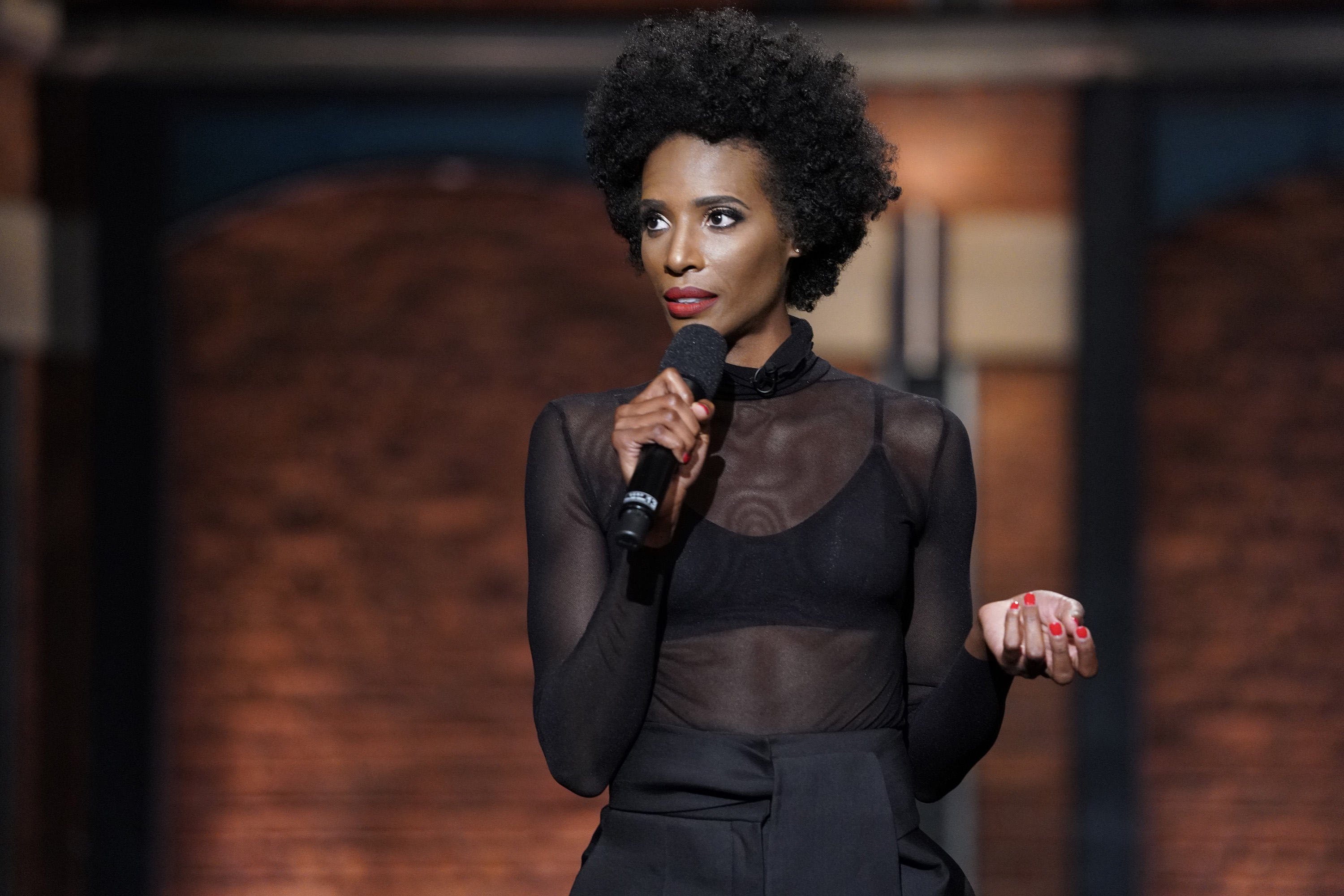 Comedian Zainab Johnson performs stand-up on Late Night with Seth Meyers.