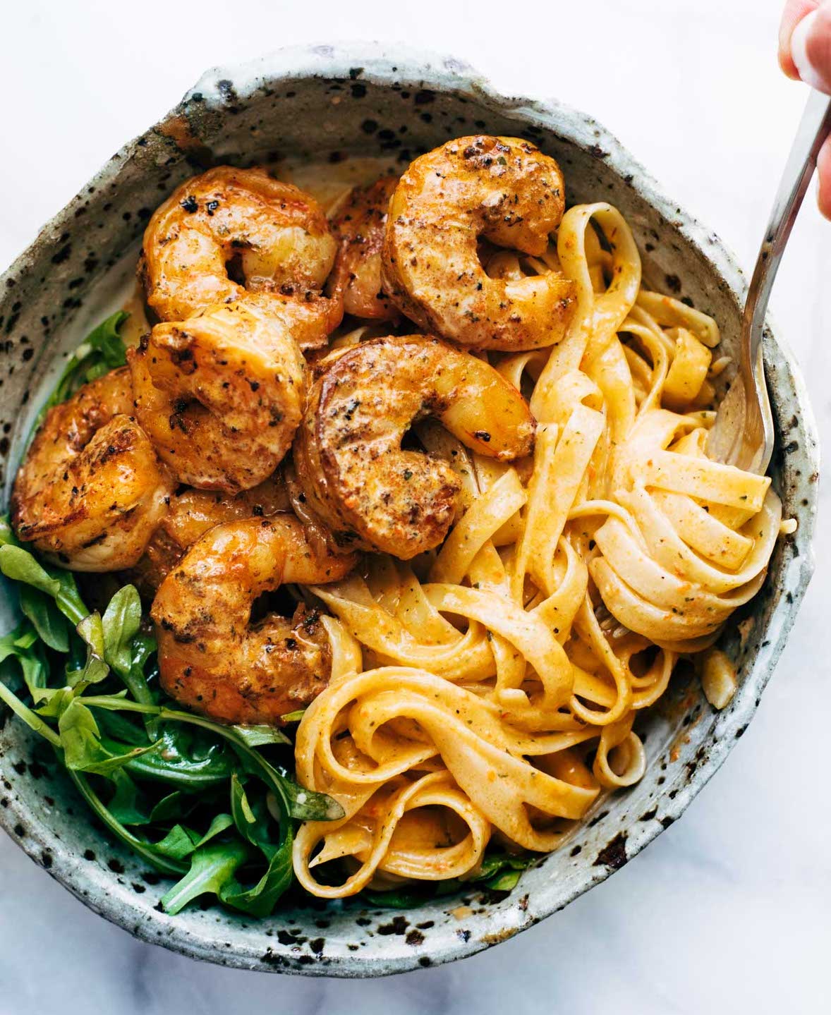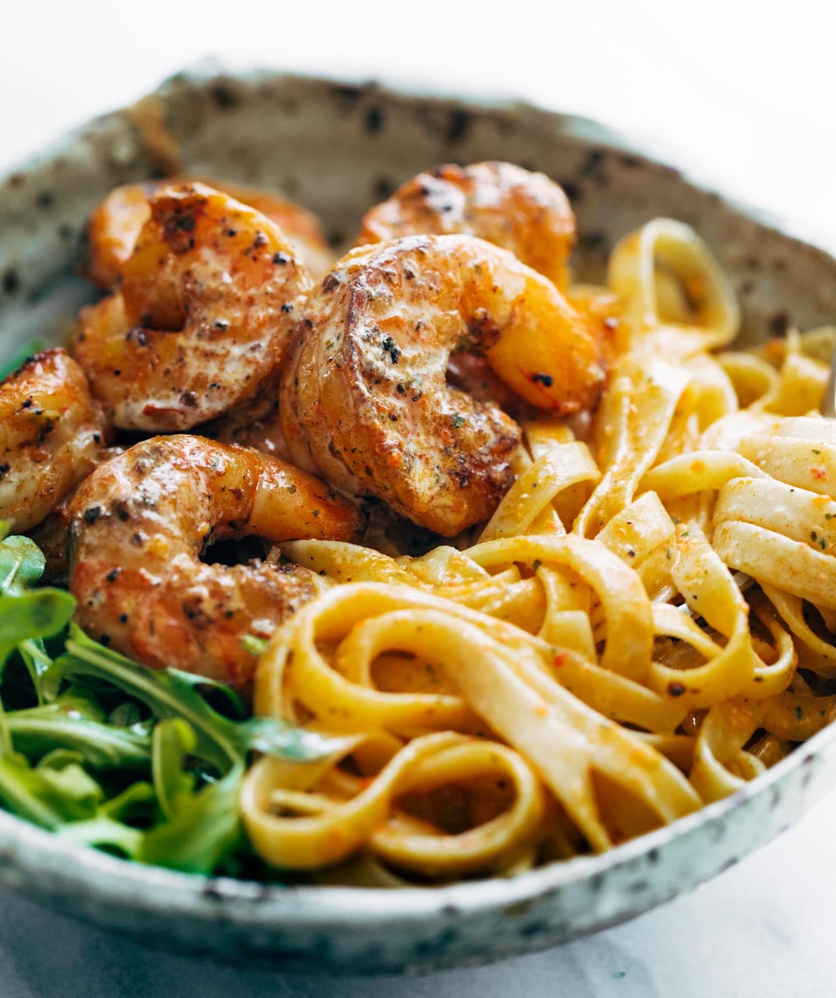Shrimp are more delicious when tucked between flat, wide, chewy fettuccine noodles. And fettuccine noodles are more delicious when coated with a silky. spicy but not hot, garlic-forward sauce. And all of it just looks a little nicer when served up with a side of crisp, almost-sweet greens.
