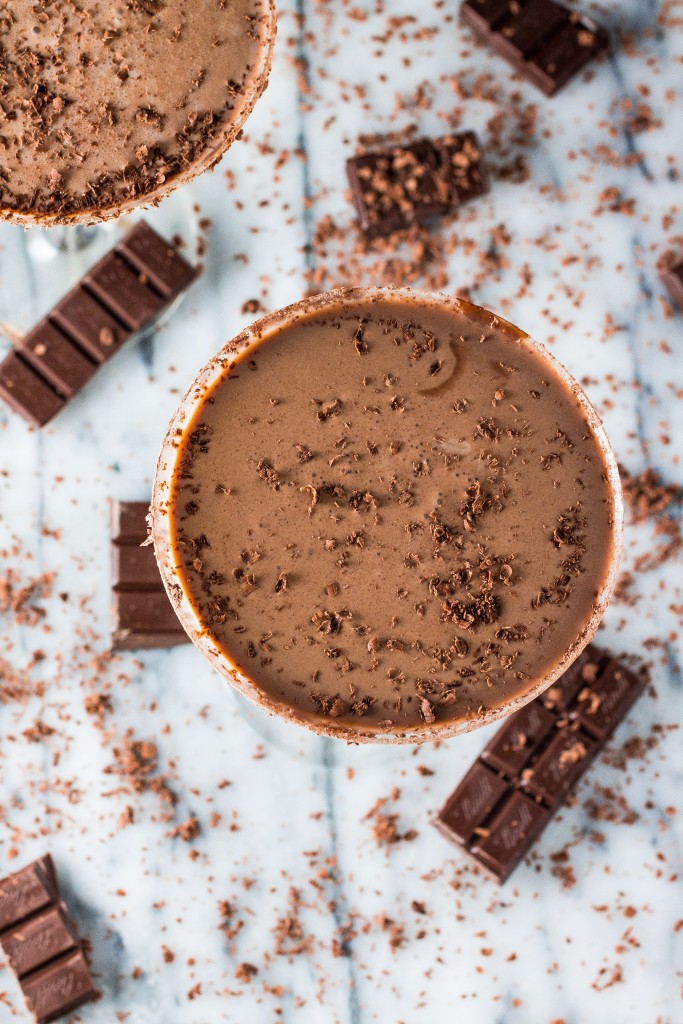 - To decorate the glasses, moisten the rim of your glasses with cold water. Turn the glasses upside down and dip them into the grated chocolate, twisting them around so you get more chocolate on the rim. Reserve.