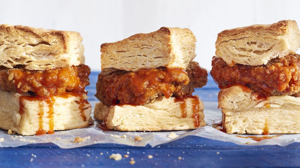 This sweet and spicy fried chicken recipe is flavored with honey and hot sauce, and it tastes even better wedged between flaky buttermilk biscuits.